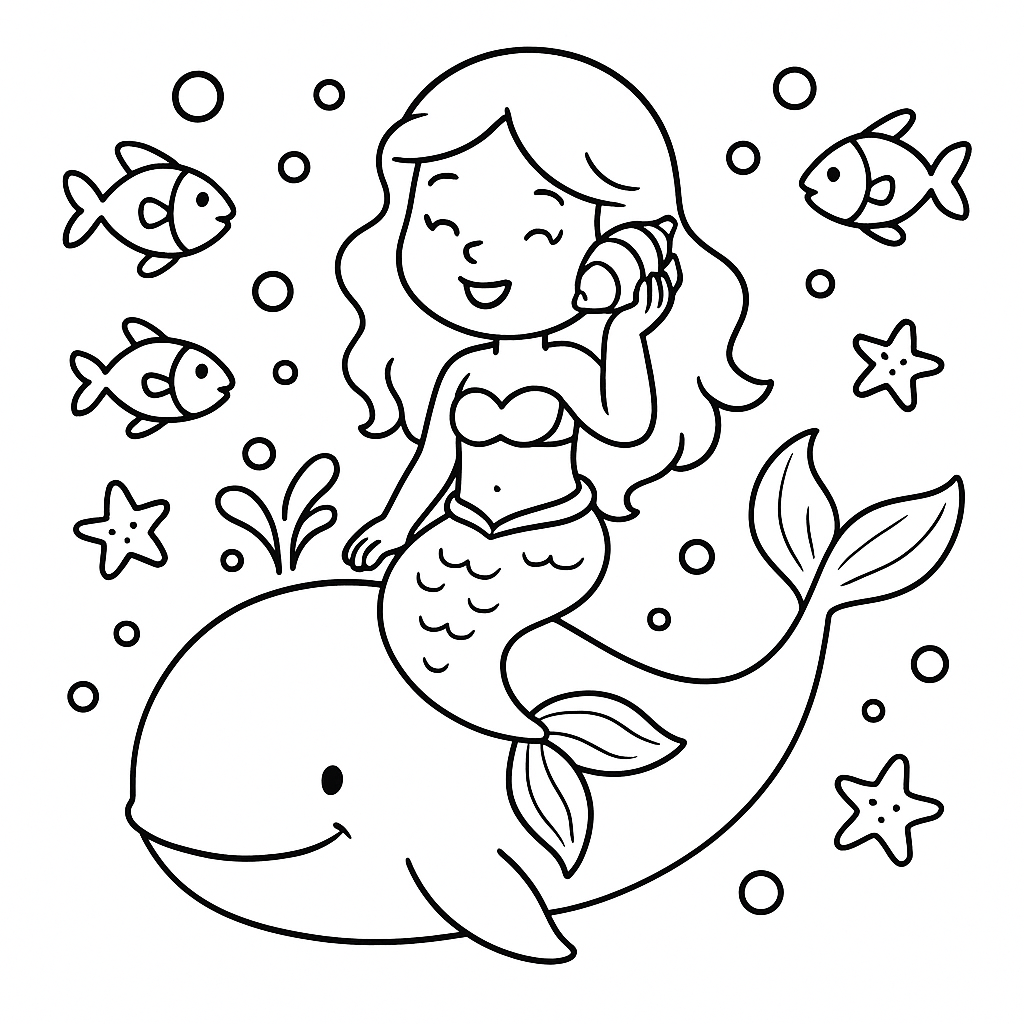 Color a magical underwater scene with a mermaid on a whale's back and fish swimming around.