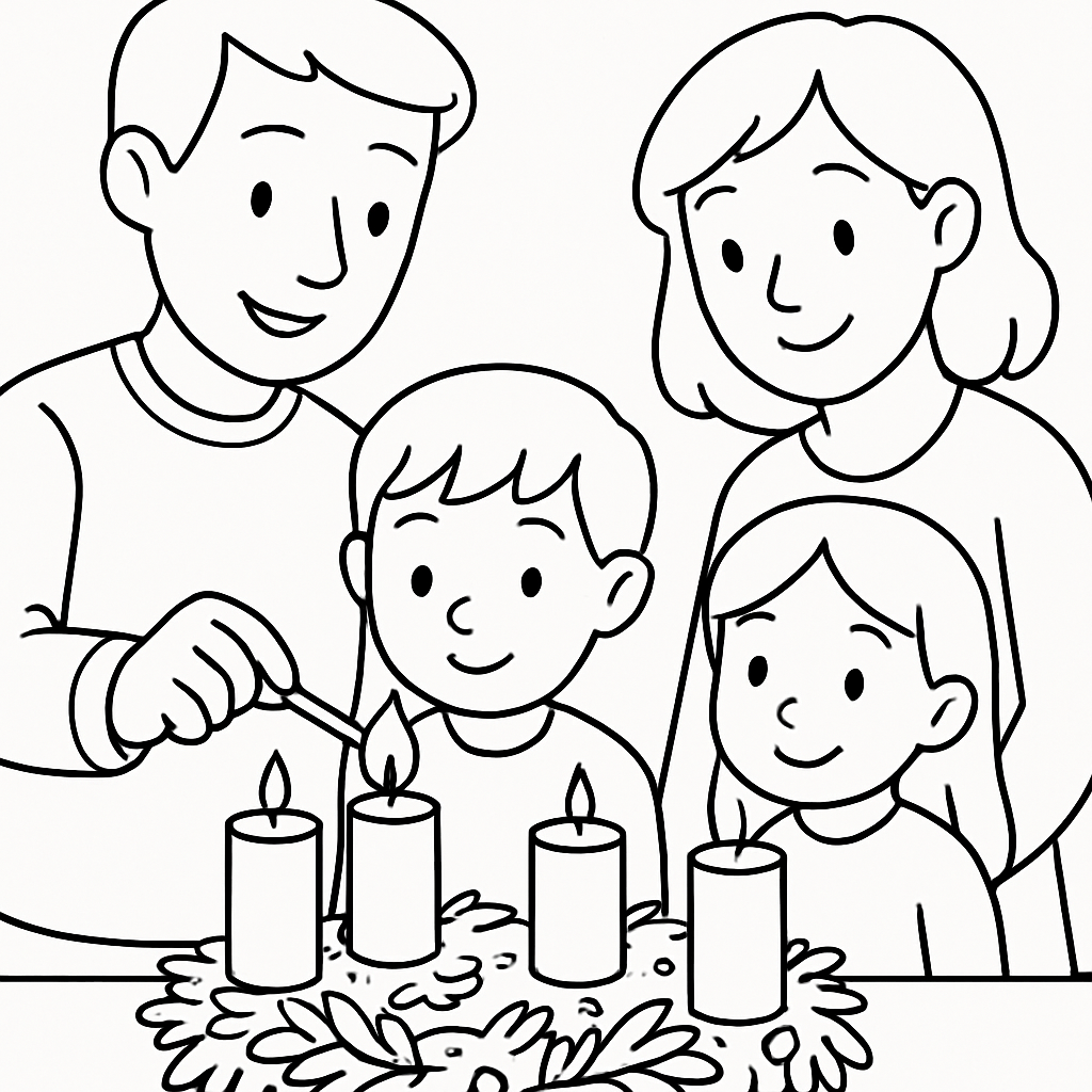 Eine Familie zündet die erste Kerze am Adventskranz an, während die anderen drei Kerzen deutlich sichtbar sind.
