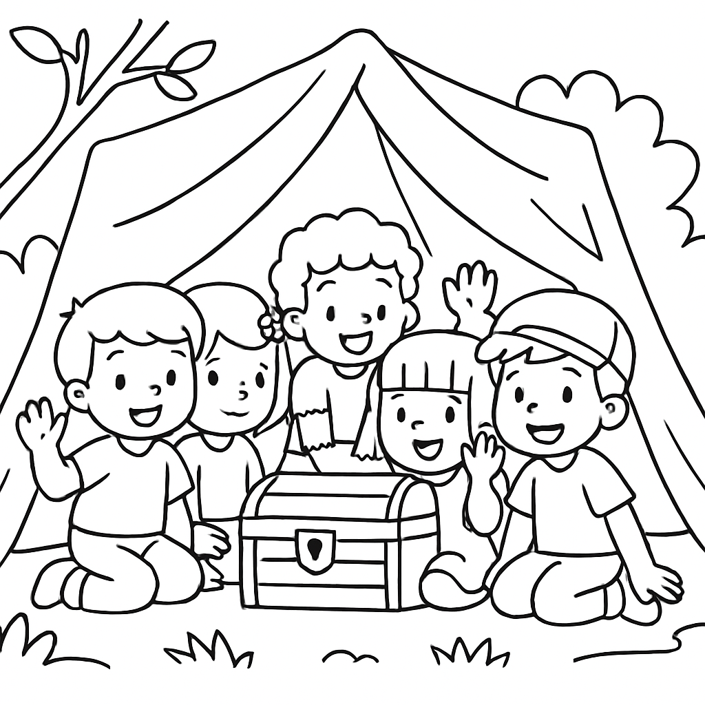 Fünf fröhliche Kinder, die zusammen an ihrem geheimen …